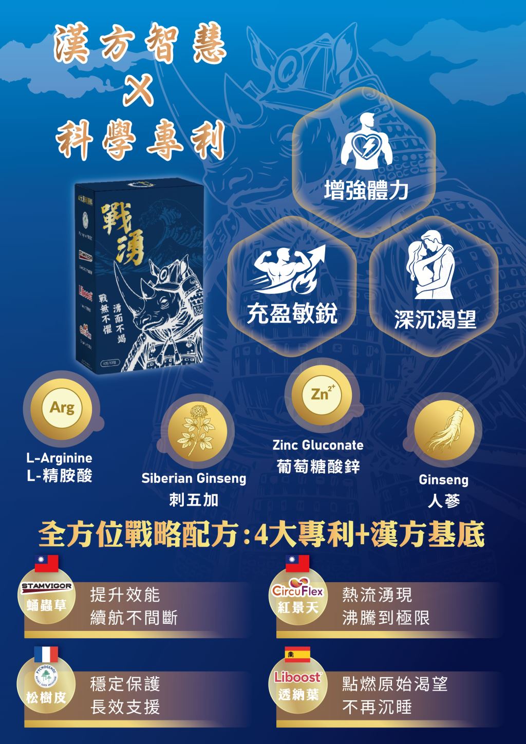 戰湧結合多種植物萃取與專利成分,嚴選精胺酸、蛹蟲草子實體、紅景天、人參、刺五加與松樹皮萃取物,並搭配專利透納葉與鋅等營養元素,打造融合漢方草本與現代機能概念的複合配方。多元成分協同設計,作為日常循環與活力補給的營養選擇。