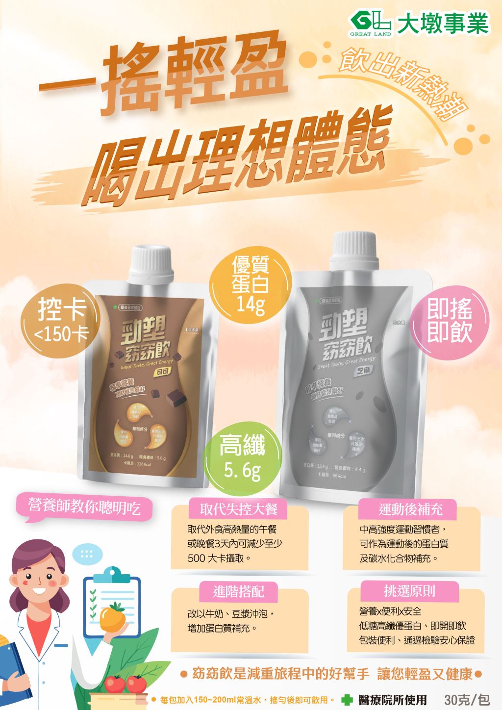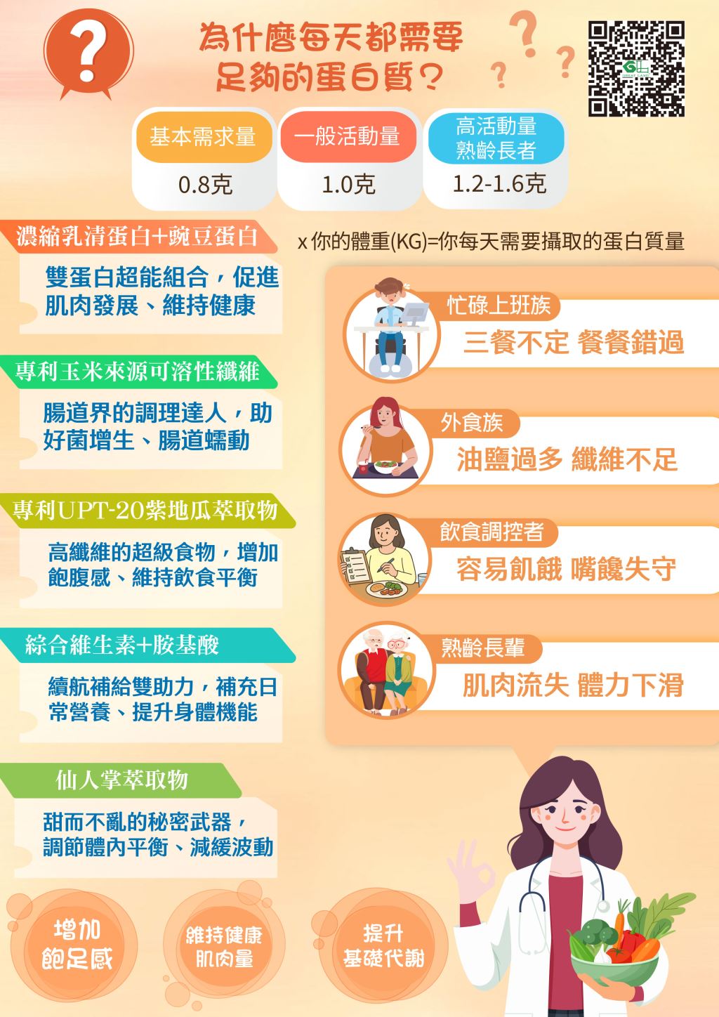 雙重蛋白結合搭配專利 UPT-20 紫地瓜與黑五穀,加上維生素與高纖成分,打造更均衡的日常營養補給。一杯就能補充植物穀粉、蛋白質與礦物質,適合外食忙碌、需要提升營養密度或想增加飽足感的人。