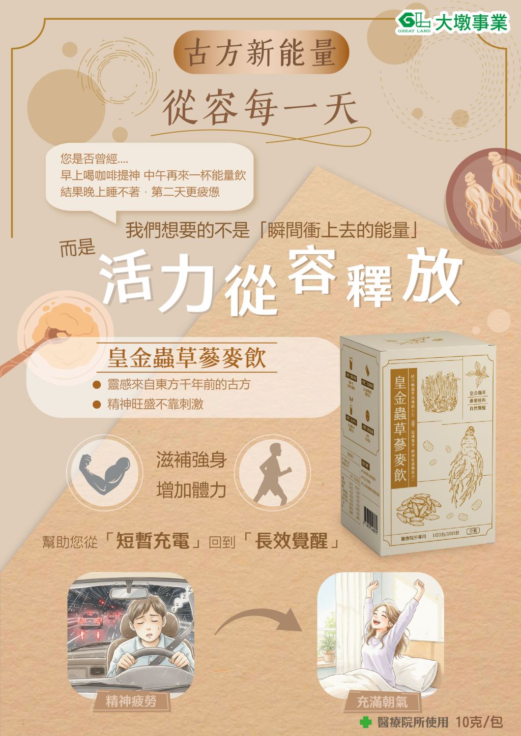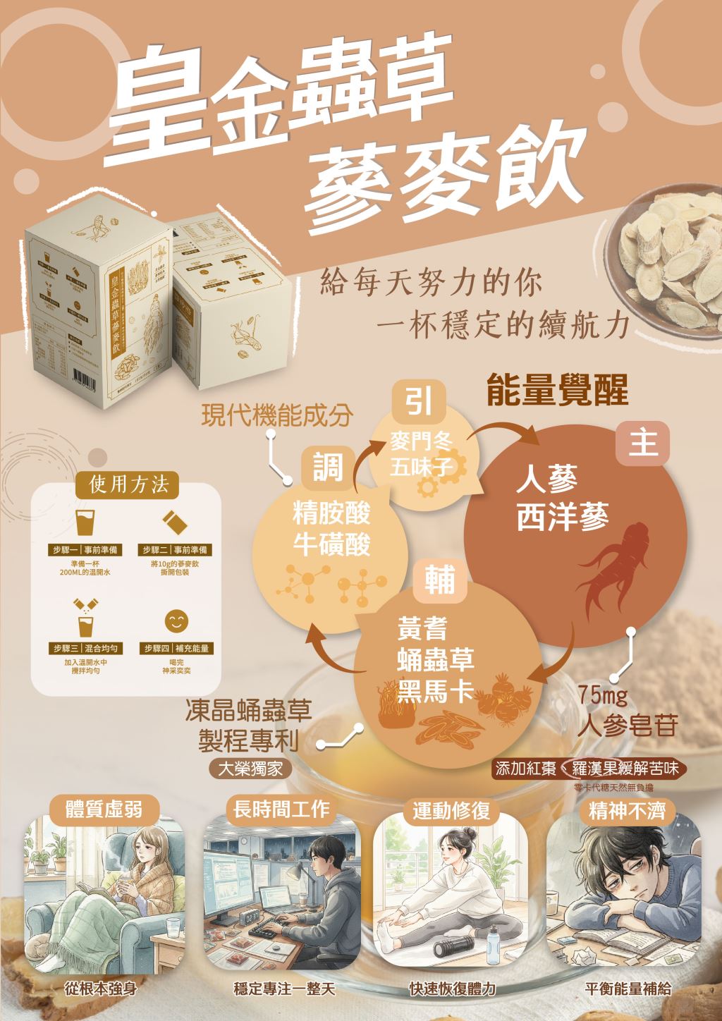 皇金蔘麥飲以人蔘、西洋蔘為核心,搭配黃耆、麥冬與五味子配伍組合,並結合蛹蟲草、牛磺酸、L-精氨酸與黑馬卡,構築出兼具傳統草本與現代營養概念的複合配方,多種精選素材,呈現溫潤細緻的草本風味,與日常飲食補給密切相關。